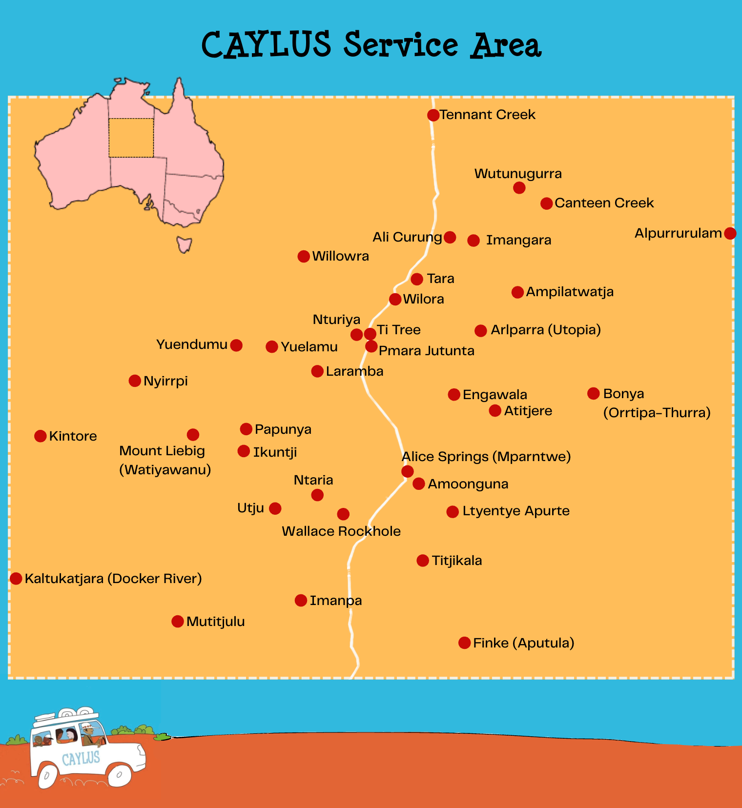 The CAYLUS Service area spans communities across the bottom half of the Northern Territory. CAYLUS only works in communities at the request of local people and agencies, over the 19 years that we have operated we have gradually extended our services to new sites. While CAYLUS primarily services this region, we have occasionally provided assistance to communities further away. In the NT, we have assisted Darwin, East Arnhem, Tennant Creek and Katherine, and in WA, Kiwirrkurra, Balgo and Jigalong.